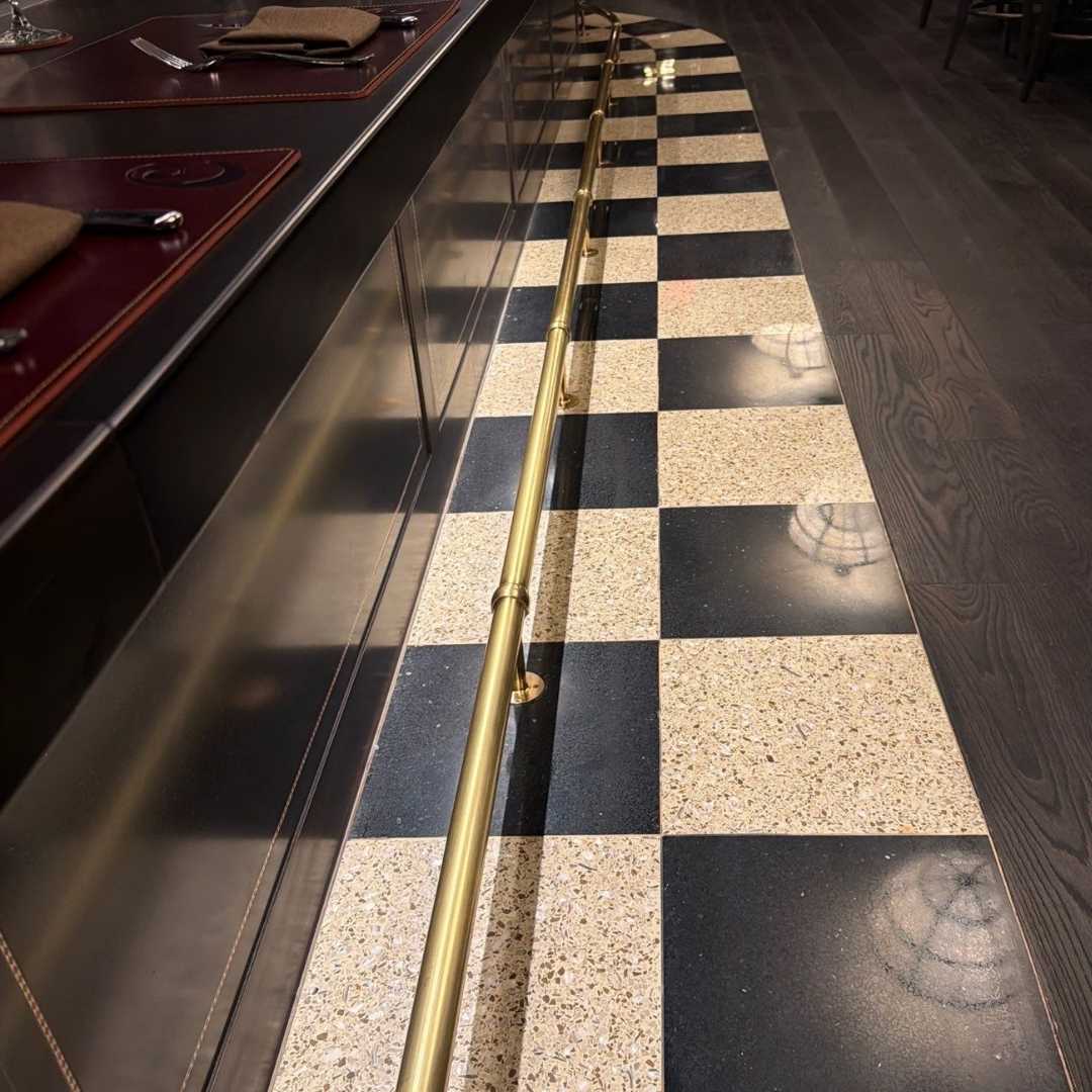 In addition to the flooring, N-Motion treated the restaurant’s brass elements: